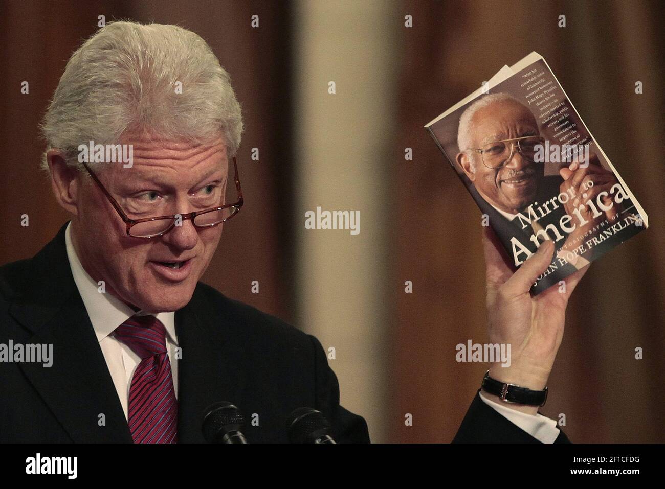 Former President Bill Clinton Holds Up A Copy Of John Hope Franklin S Mirror To America During A Memorial Service At Duke Chapel On The Duke University Campus On Thursday June 11 2009